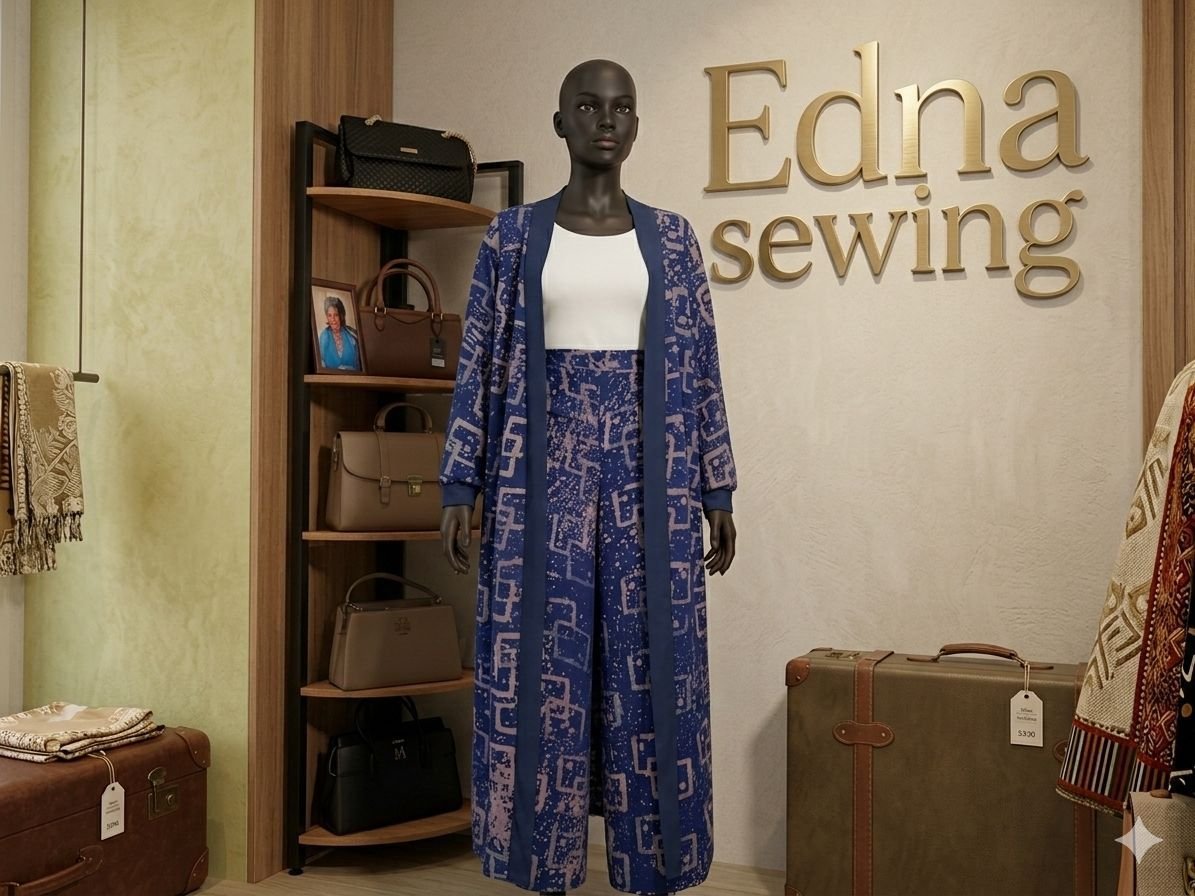 Cet ensemble se distingue par son kimono fluide, pièce maîtresse aux motifs captivants, qui apporte une structure légère et un mouvement gracieux à la silhouette. La palette de couleurs chaleureuses, rigoureusement identique sur l’ensemble des pièces, crée une unité visuelle harmonieuse et apaisante.